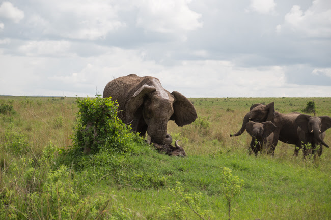 “She slammed the buffalo back on the ground and backed up. She then herded her family to the other side of the road and continued to trumpet at the mortally wounded buffalo. The buffalo got up and staggered away as blood gushed from its side. He moved about ten feet away from the attack and fell to the ground. He did not immediately die as he kept his head up for a minute or so before completely collapsing.”